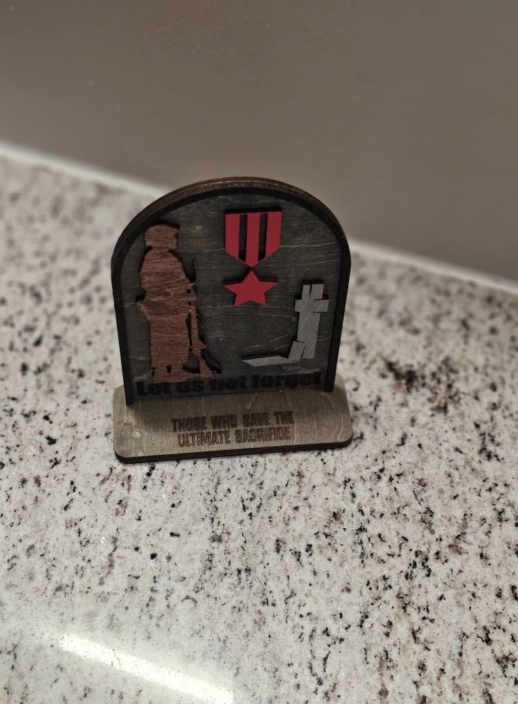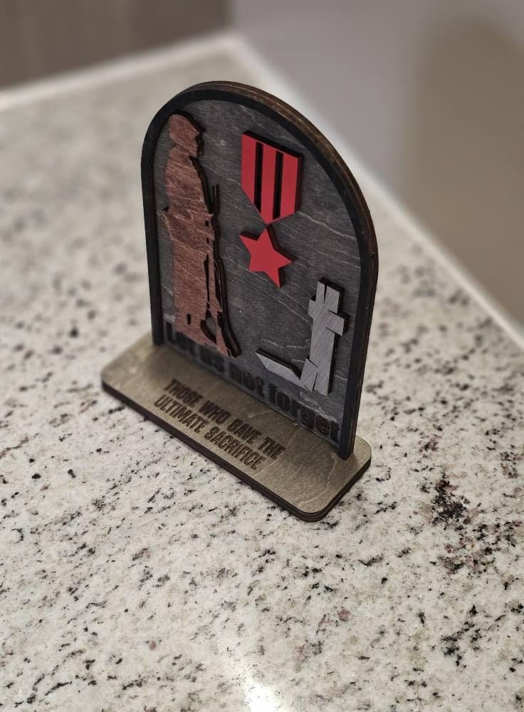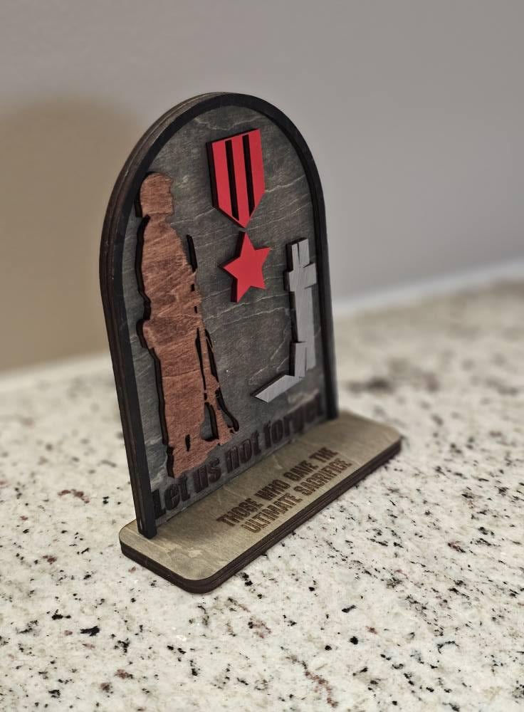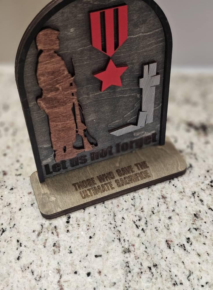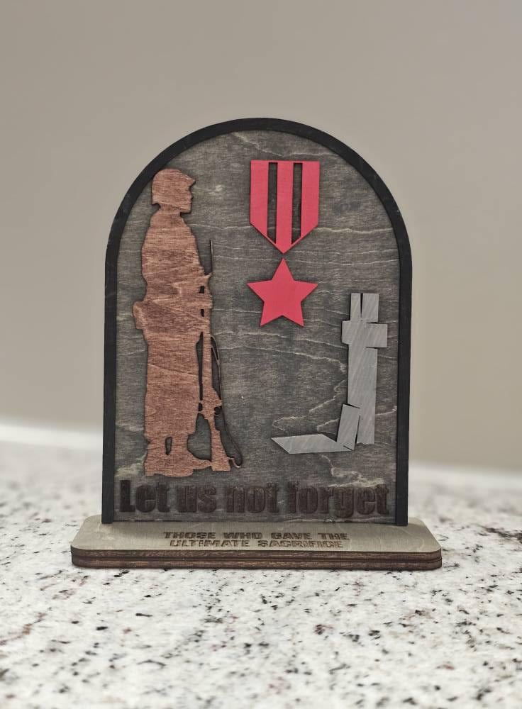 This "Let Us Not Forget" tabletop sign is a heartfelt reminder of the incredible strength, honor, and courage of those who serve. Perfect for military families, veterans, or anyone who wants to show appreciation for the men and women in uniform, this sign is a powerful tribute to their selfless service.